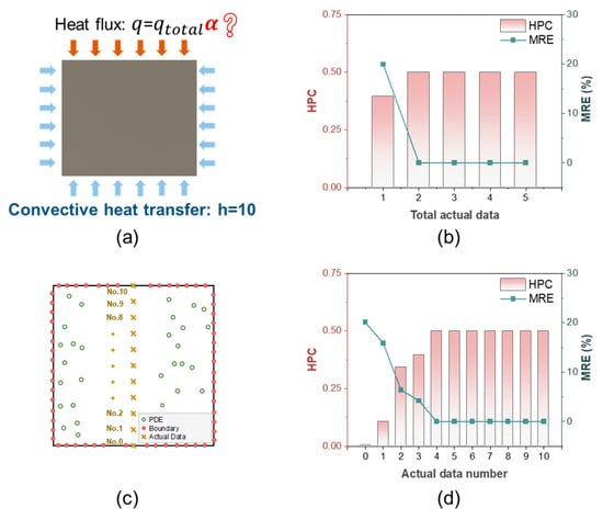 Inverse problem for HPC. (a) Boundary conditions. (b) HPC and MRE of the PINN with different total actual data. (c) Actual data sampling at different positions. (d) HPC and MRE of the PINN with actual data from different positions.