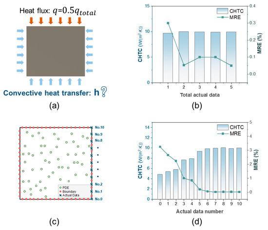 Figure 9a illustrates the boundary conditions of the simulation, where the CHTC on the right boundary is the unknown input parameter to be optimized, with an initial value of 6. Figure 9b shows the MRE of the PINN and the CHTC as various sets of actual data are incorporated into the training process. When only a single actual datum is incorporated into the training process, the PINN shows a relatively high MRE, but it exhibits superior performance in predicting CHTC. Furthermore, we also investigate the effect of actual data sampled from diverse positions at the boundary on the accuracy of the PINN. Figure 9c displays the positions of actual data at the convective boundary, and Table 4 presents the actual temperature for each actual data. The predicted results of the PINN for actual data at different sampling points are shown in Figure 9d, it can be found that the position of actual data significantly affects the accuracy of the PINN. From No.6 to No.10, the MRE of the PINN approaches its minimum value and shows signs of stabilization. However, substantial errors were observed in the experiments up to No.5, and the predictions of CHTC also exhibited significant discrepancies from the actual values. It can be found from Table 4 that the temperature risesfrom No.1 to No.5 were very small and close to the ambient temperature. Boundary conditions have minimal influence on the temperature at these specific points. Consequently, incorporating these points solely into the training process makes it challenging to constrain the optimization process of the PINN, resulting in poor accuracy when identifying unknown parameters.