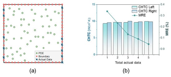 The experimental conditions are shown in Table 3. In the case of two unknown CHTCs at the left and right boundaries, 1–5 actual data points are collected separately from the left and right boundaries, as depicted in Figure 10a. These data points are then incorporated into the training of the PINN. Figure 10b illustrates the MRE of the PINN and the two CHTCs as various datasets of actual data are integrated into the training process. The experimental findings demonstrate that by incorporating a limited quantity of actual data, the PINN can effectively predict the friction temperature field and provide more precise estimations for the actual values of two unknown CHTCs.