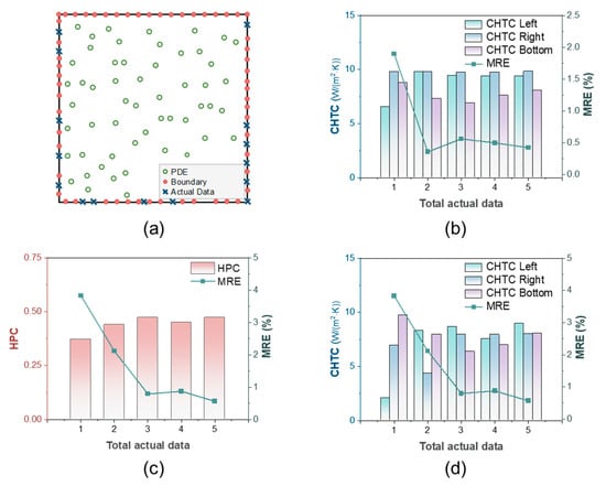 Results of multiple unknown parameters. (a) Actual data sampling of three unknown CHTCs. (b) Three CHTCs and MRE of the PINN with different total actual data. (c) HPC and MRE of the PINN with four unknown parameters. (d) CHTCs and MRE of the PINN with four unknown parameters.