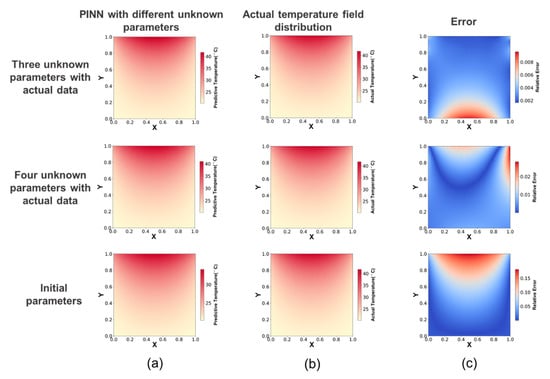 Temperature field predicted by the PINN. (a) Temperature field predicted by the PINN with different unknown parameters. (b) Actual temperature field distribution. (c) Relative error of the PINN.