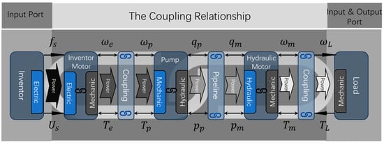 The core components of the hydraulic system that realise the system functions include the inverter for speed control, the inverter motor for electromechanical coupling, the hydraulic pump and hydraulic motor that provide the interfaces for machine–hydraulic coupling and hydraulic–machine coupling, and the load components. In order to more accurately describe the system dynamic characteristics of the causal relationship, in addition to the motor, pump, and motor involved in the energy domain conversion of the functional interface, the links of the connection interface on the system dynamic characteristics of the impact also need to be considered. The coupling relationship of each link is shown in Figure 1. The two couplings and a section of hydraulic piping are used to achieve mechanical power and hydraulic power connection and transfer, respectively.