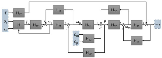 Equations (2)–(5) and (9) constitute the state equations of the system. The damping of each link of the system, as well as the flow correction coefficient and , change weakly with the operating conditions. Considering the simplified model, due to the small variation in damping and flow correction coefficients with operating conditions, they are interpreted as constants, and their effects on the system dynamics are not considered for the time being. Laplace transformations are performed for (2)~(5) and (9), respectively.
