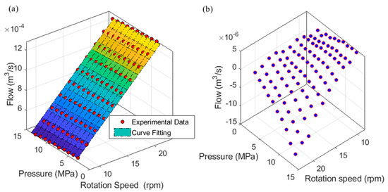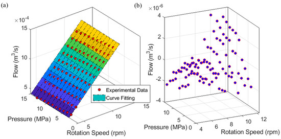 In order to achieve the identification of the key node parameters, according to the piston pump flow in Equation (6), a test is designed to identify the parameters of the equation. The least squares method is used to solve the optimal fitting of the speed- and pressure-related flow loss coefficients and , and the flow correction coefficients are also calculated. Figure 3a shows the comparison of the fitted planes of the flow of the piston pump obtained by the least squares method and the test data, and Figure 3b shows the flow correction coefficients, i.e., the residuals of the fitted results and the test results.