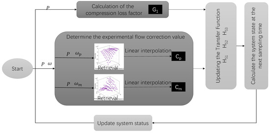 During the simulation, there are time-varying parameters controlled by the system state variables in the transfer functions H51, H52, and H53, and the inputs of the link H53, which need to be updated in real time according to the system state. By the S-function module, the system state variables are acquired in real time, the system state variables are used as the retrieval and calculation criteria for the relevant time-varying parameters, and the time-varying parameters in the system are updated in each calculation cycle according to the flow shown in Figure 5 before participating in the simulation calculation.