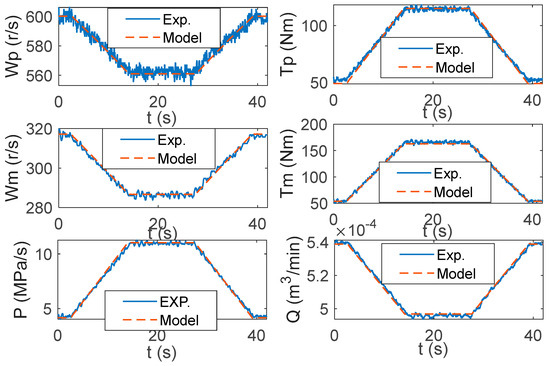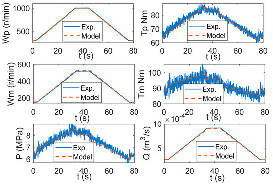 Varying speed operation: Keeping the load input at 0.8 V. The accuracy of the model over a wide range of rotational speed variations was verified by adjusting the inverter input and controlling the motor speed variation (both deceleration and acceleration). When the system accelerates from 280 rpm to 1000 rpm, the torque or pressure of each sub-system exhibits step characteristics at the beginning and the end because the rotational speed is affected by the inertia of the system. When the system speed accelerates, the powertrain needs to output additional torque to increase the system kinetic energy. On the contrary, the torque of the dynamical system is small. The model accurately reproduces the state variables under large-scale speed operating conditions.