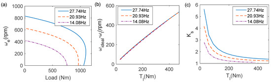 Figure 9c shows the system speed static stiffness under different load conditions. The speed stiffness of the system is smaller in the low-frequency working condition of the power supply, and it decreases faster with an increase in the load. Under light-load and high-speed operation conditions, is maximum. But, with an increase in load, gradually decreases.