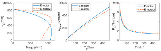 Figure 10c shows the effect of different motor mechanical characteristics on the output speed stiffness of the system. The speed stiffness of the system with E-motor2 has fewer differences than the system with E-motor1 under the same speed and load conditions. The above analysis shows that the speed stiffness of the system cannot be improved significantly by improving the mechanical characteristics of the motors to reduce the operating slip rate.