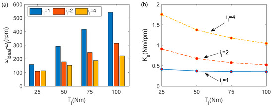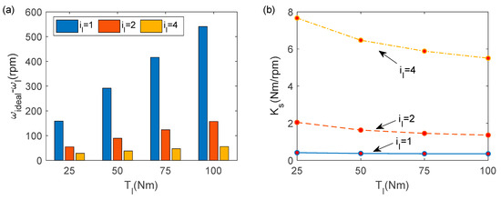 Figure 12a shows that the output speed drop caused by the load decreases with an increase in the reduction ratio due to the effect of speed reduction and torque increase. The output speed reducer effectively suppresses the absolute amount of output speed drop caused by the load. The ability to inhibit changes in system speed becomes stronger with a larger reduction ratio. The speed reducer’s deceleration effect reduces the absolute amount of speed dropout at the output end proportionally as the reduction ratio increases. Additionally, the speed stiffness at the output end becomes larger, as shown in Figure 12b. The speed stiffness at the output end of the speed reducer increases more than the motor end speed stiffness. Combining both effects, different reduction ratios (i2 = 2, i3 = 4) increase the stiffness of the system speed by nearly 4 and 16 times, respectively. It can be concluded that the increase in speed stiffness is proportional to the square of the reduction ratio.