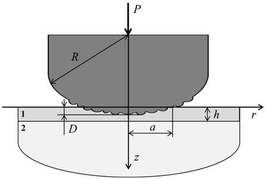 Let us consider the indentation of an axisymmetric punch, whose macroshape is described by the function (R is the curvature of the punch contacting surface), into an elastic layer (1) of thickness h, lying on an elastic half-space (2) (Figure 1). It is assumed that there are no shear stresses between the punch and the layer that takes place at a negligible friction coefficient. The punch surface has a roughness determined by the shape of asperities, the characteristic size of which is much smaller than the punch size, and by the density of the asperities distribution on the punch surface.