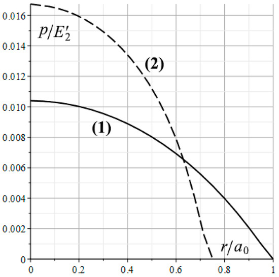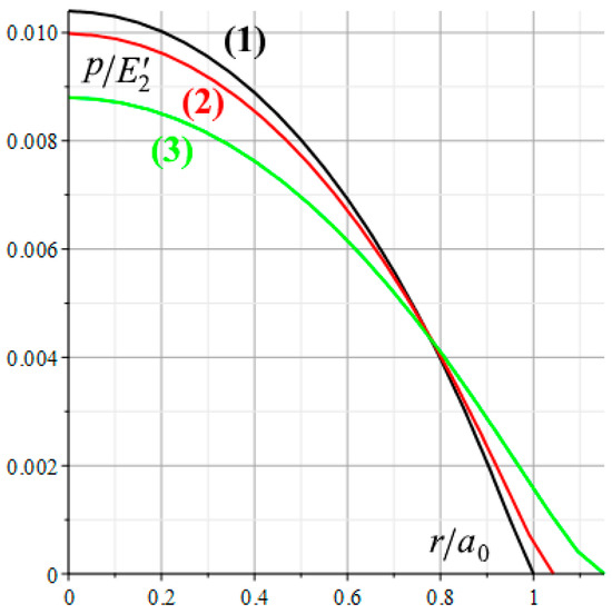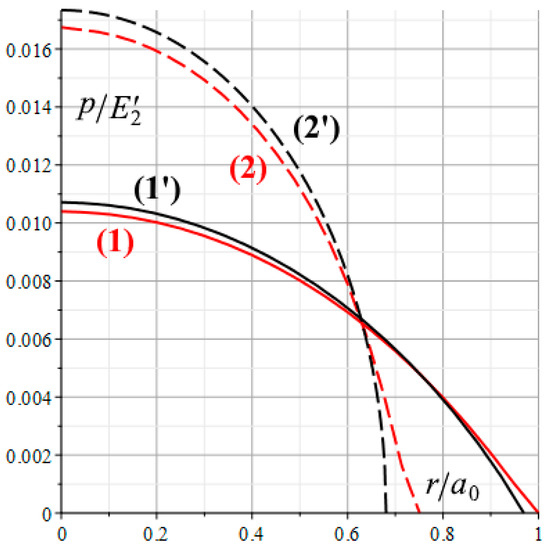 Let us denote the radius of the nominal contact area for the considered parameters of roughness and thin layer as a0 () and fix the load P () found in this case. When studying the distribution of the nominal contact pressures in other cases (with other values of the defining parameters of the problem), the radius of the nominal contact area a is selected in such a way that load , so it is the same for all the cases under consideration.