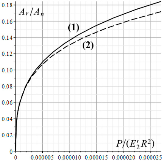 In the case of indentation of the considered rough punch into the homogeneous elastic half-space under the action of the same load P, the real contact area, based on calculations, is slightly more than 17% of the nominal one, namely . Moreover, the nominal contact area An is equal to , that is, it is reduced by almost half compared to the indentation into the layered base. Thus, the presence on the elastic half-space surface of a thin layer, characterized by a smaller elastic modulus compared to the half-space material, increases the values of both the relative contact area and the real one Ar.
