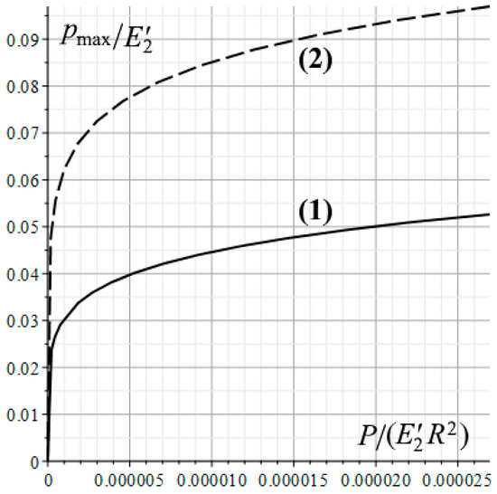 In the case of indentation of the punch with the same roughness parameters into the homogeneous elastic half-space, the maximum pressure on a single contact spot, as follows from (13) and the results presented in Section 4.2.2, is . Figure 5 shows the dependences of pmax on the load applied to the rough punch for two bases under consideration. The results indicate that the presence of a thin soft layer leads to a noticeable decrease both in the nominal and real contact pressures, which take place under a given value of the load applied to the punch.