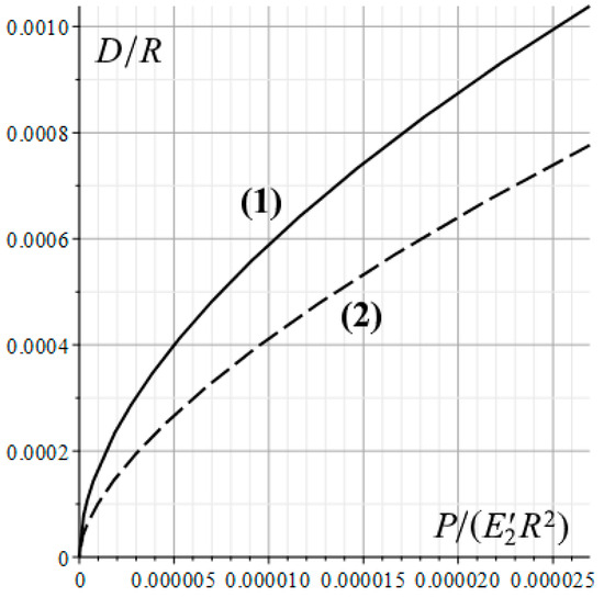 where is the is the complete elliptic integral of the first kind, , , E1 and are the Young’s modulus and Poisson’s ratio of the surface layer, D is the indentation depth, and coefficients A1 and A2 depend on the relative mechanical characteristics of the layer and the half-space and the boundary condition between them (no friction or complete adhesion). In the case of equality of the Poisson’s ratios of the layer and the half-space () , where , E2 and are the Young’s modulus and Poisson’s ratio of the half-space. The coefficient A2 is 0.5 for the no-friction condition between the layer and the half-space, and in the case of the complete adhesion, it is determined as [31]: