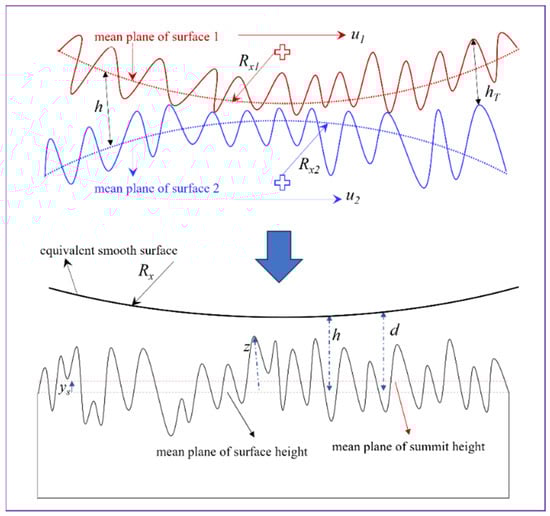 where is the Probability Density Function of asperity heights, which is explained later in Section 2.4.1; z = z1 + z2 is the summation of asperity heights, as shown in Figure 1; z1 is the asperity height from the mean plane of surface 1; z2 is the asperity height from the mean plane of surface 2; Rx1 and Rx2 are the radius of curvature of surface 1 and surface 2, respectively; and Rx is the reduced radius of curvature; the symbols ys and d are defined in Section 2.4. According to the Greenwood and Williamson (GW) theory [], the contact between two rough surfaces can be considered the contact between a smooth, rigid plane and an equivalent (composite) rough surface.