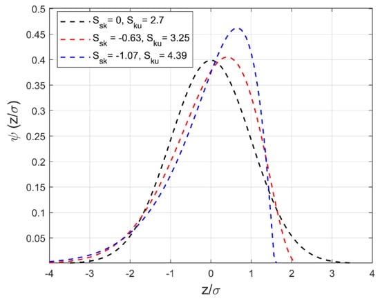 Normalized probability density functions for normalized asperity heights with different skewness and kurtosis values and a zero mean.