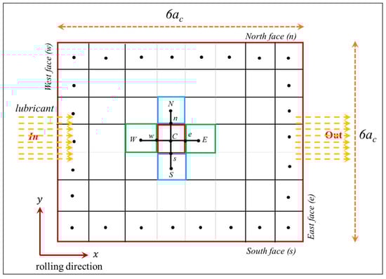 Recently, an extension of the FBNS solver (EHL-FBNS) considering the elastic deformation of contacting bodies has been reported by Hansen et al. []. The EHL-FBNS solver, which is based on the Newton–Rapson method, has been proven to be a comparatively fast and efficient solver for EHL analysis [,,]. In this work, the EHL-FBNS algorithm is extended according to Ref. [] by implementing non-Gaussian flow factors in the Poiseuille terms and the average film thickness in the Couette term of Equation (1). The finite volume method (FVM) was used for discretizing the Poiseuille and Couette terms of Equation (1) []. The Poiseuille terms were discretized using a second-order central interpolation scheme, whereas the Couette term was discretized using a first-order upwind interpolation scheme []. For the hydrodynamic pressure, the Dirichlet boundary condition (ph = 0) was applied at all faces of the domain []. Figure 3 shows a schematic diagram of exemplary stencils within the two-dimensional (2D) discretized EHL domain of size Lx × Ly = 6ac × 6ac (ac is the contact radius), along the east, the west, the north, and the south faces. For cavitation (θ), the Dirichlet boundary condition (θ = 0) was employed on the west face, whereas the Neuman boundary condition was applied to the remaining faces of the domain []. To meet the load balance criterion, the rigid body approach (hd) was updated at each iteration using the PID controller method [] until the load balance tolerance (10−6) was encountered. In this work, the solution was expected to finish when the overall absolute residual () defined by Equation (11) at any iteration number (n) becomes less than or equal to the specified tolerance (1 × 10−6). The expressions of the residuals used in this work are given in Appendix A. Detailed information on the discretization of the Reynolds equation, the calculation of elastic deformation (δ), and load balance can be found elsewhere [,].