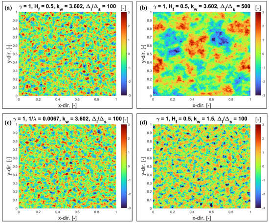 It is known that tribological components (i.e., rolling bearings, gears, cams, etc.) are finished by conventional machining processes like grinding, lapping, honing, and shot peening []. These machining processes generate various surface features that can be characterized by topography parameters. A brief description of the topography parameters used in Table 1 can be found elsewhere []. In this work, a rough surface generation method developed by Pérez-Ràfols et al. [] was employed. This method uses parameters defining the Weibull height distribution function and power spectral density (PSD) as inputs to generate rough surfaces. Basically, two types of PSD expression (self-affine and exponential) were used. A brief description of the Weibull height distribution function and PSD is given in Appendix B. Table 1 represents the input parameters used for the numerical generation of artificially rough surfaces. The Hurst coefficient (Hf), correlation length (1/λ), and wavelength ratio (Δl/Δs) are related to the spectral properties of the rough surfaces, whereas the shape parameter (kw) is related to the Weibull height distribution function. The Hurst coefficient (Hf) is a parameter that indicates the roughness at the border of the object [].