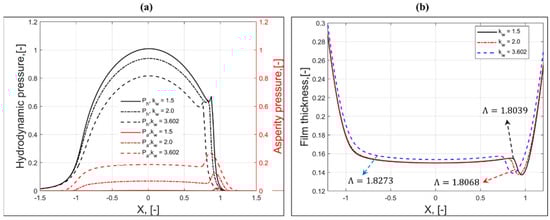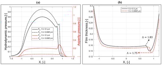 Distribution of (a) dimensionless hydrodynamic and asperity pressure and (b) dimensionless film thickness along the X-axis and at Y = 0 for different wavelength ratios (Hf = 0.5, γ = 1, and kw = 3.602).