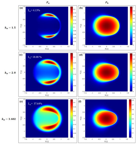 Another interesting observation that can be seen in Figure 5a is that the effect of negative skewness values (for kw = 1.5 and 2) on the Ph is almost negligible near the inlet of the contact zone. However, a decrease in the Ph is found for kw = 3.602 (Gaussian surface). This trend in variation in hydrodynamic pressure near the contact zone inlet should affect the film thickness distribution because the central film thickness is generally affected by a variation in lubricant and surface properties (in the case of ML) at the inlet of the contact zone. Figure 5b shows the distribution of film thickness along the X-axis for different kw. It can be clearly seen from Figure 5b that the film thickness at the inlet as well as at the central part of the contact zone is almost the same for kw = 1.5 and 2.0, which confirms the negligible effect of negative skewness. However, for Gaussian roughness (kw = 3.602), the film thickness increases near the inlet and central part of the contact zone. As illustrated in Figure 5b, the minimum film thickness or film parameter (Λ = hmin/σ) is slightly affected by non-Gaussian roughness. The minimum film thickness, or Λ, increases with an increase in the shape parameter. It can also be observed from Figure 5b that for Gaussian roughness (kw = 3.602), the location of the minimum film thickness is slightly shifted inside of the contact zone due to a significant drop in the hydrodynamic pressure. Isometric plots of dimensionless asperity (Pa) and dimensionless hydrodynamic (Ph) pressure distributions for different shape parameters (kw) are presented in Figure 6a–f. It can be clearly seen that the asperity load ratio (La) increases with an increase in the shape parameter.