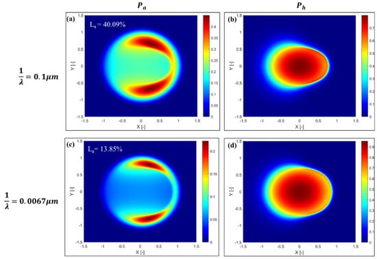 It is known that the correlation length (1/λ) provides the spatial information of rough surfaces []. Various engineering rough surfaces display the exponential form of the autocorrelation function () [], and it has extensively been used for the numerical generation of isotropic rough surfaces [,]. The distribution of dimensionless asperity (Pa) and hydrodynamic pressure (Ph) along the X-axis for different correlation lengths is presented in Figure 7a. It can be seen that Ph increases with a decrease in the correlation length (1/λ), and Ph increases significantly for a lower correlation length due to a reduction in asperity-to-asperity contacts (or asperity pressure). A rough surface with a smaller correlation length (1/λ) leads to a smoother surface (flattened roughness peaks), which results in fewer asperity contacts and ultimately leads to a significant reduction in the load carried by asperities. The reduction in Pa at the lower correlation length is shown in Figure 7a. Figure 7b represents the distribution of the dimensionless film thickness along the X-axis for different 1/λ. As illustrated in Figure 7b, the central and minimum film thickness decrease with a decrease in 1/λ. It should, however, be noticed that the location of the occurrence of minimum film thickness slightly increases for lower values of 1/λ due to an increase in the hydrodynamic lift. It can also be seen from Figure 7b that, however, the film parameter (Λ) decreases with a decrease in 1/λ. It can be argued that the film parameter or minimum film thickness should increase for a lower 1/λ due to an increase in the hydrodynamic lift. This happens due to the off-line (macro–micro approach) [] calculation of asperity contact pressure. This is the prominent reason why full-scale deterministic ML solutions always provide a more feasible film thickness, or Λ []. Figure 8a–d represent isometric plots of Pa and Ph for different correlation lengths (1/λ). It can be clearly seen that the asperity load ratio (La) decreases with a decrease in the correlation length (1/λ).
