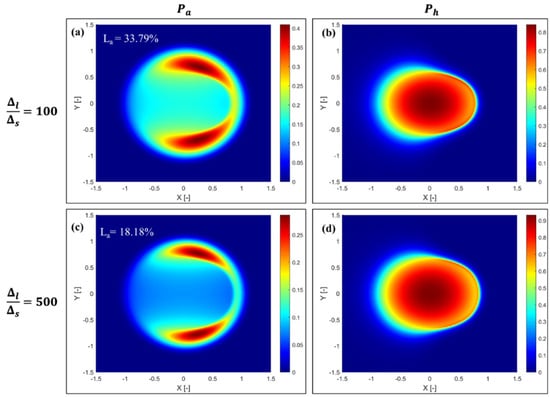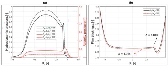 As stated in Refs. [,], the wavelength ratio (Δl/Δs) is related to lower and upper cut-off frequencies (ql and qs), which have been used to define the width of the power spectrum of a rough surface. It has been suggested in Ref. [] that the wavelength ratio should not be less than 100 to generate a Gaussian rough surface with sufficient accuracy in the HPD (height probability distribution). In this work, two different values of wavelength ratio (Δl/Δs = 100 and 500) are chosen, and its effect on mixed lubrication is investigated. Figure 9a represents the variation of dimensionless asperity and hydrodynamic pressure along the X-axis for different Δl/Δs. It can be seen that the Ph increases with an increase in Δl/Δs. For Δl/Δs = 500, a significant increase in Ph is observed in the middle of the contact zone, whereas a small increment in Ph is observed near the inlet and outlet of the contact zone. Also, the location of the pressure spike is shifted towards the inside of the contact zone for lower Δl/Δs. Higher values of the Δl/Δs ratio eliminate the high frequency components, and the simulated rough surface contains mostly high wavelength components, which ultimately leads to flattened roughness peaks (see Figure 4b). The flattened roughness peaks at higher Δl/Δs ratios result in fewer asperity-to-asperity contacts, which ultimately diminishes the asperity pressure. As a result, an increase in hydrodynamic lift occurs for high Δl/Δs ratios. The film thickness distribution along the rolling direction for different Δl/Δs ratios is presented in Figure 9b. It can be seen that the central and minimum film thickness (or film parameter) decrease with an increase in the Δl/Δs ratio. Figure 10a–d represent the isometric plot of asperity and hydrodynamic pressures for different Δl/Δs ratios. It can be clearly seen that the asperity load ratio (La) significantly decreases with an increase in the Δl/Δs ratio.