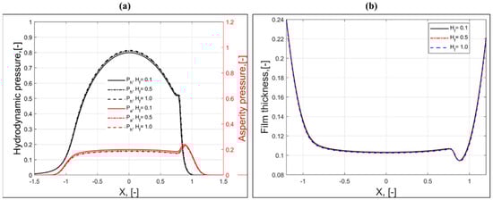 Distribution of (a) dimensionless hydrodynamic and asperity pressure and (b) dimensionless film thickness along the X-axis and at Y = 0 for different Hurst coefficients (Δl/Δs =100, γ = 1, and kw = 3.602).