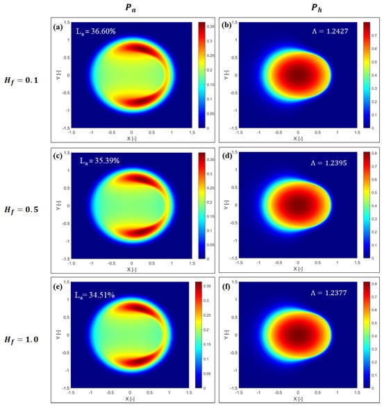 Recently, it has been reported by Prajapati and Tiwari [] that theoretically, the root-mean-square (RMS) roughness (σ) and RMS slope () decrease with an increase in Hurst coefficient. The theoretical trend between σ and Hf has also been confirmed by performing pin-on-disc pure sliding experiments []. Figure 11a shows the variation of dimensionless asperity and hydrodynamic pressures along the X-axis for different Hf. It can be seen that Pa decreases with an increase in Hf. As illustrated in Figure 11a, the change in Pa and Ph is quite distinct at the midpoint of the contact zone. The reason for a slight decrease in Pa at higher Hf is due to the smoothness of the simulated surface, which increases with an increase in Hf. A smoothed rough surface consists of blunt roughness peaks, which results in fewer asperity contacts and ultimately decreases the asperity pressure. It can also be seen from Figure 11a that the change in Pa and Ph with Hf is almost negligible near the inlet and outlet of the contact zone, which indicates a small change in minimum film thickness. The film thickness plot for different Hf values is shown in Figure 11b. As postulated, Figure 11b confirms the small variation of the central and minimum film thickness with Hf. Isometric plots of Pa and Ph for different Hf are presented in Figure 12a–f. It can clearly be seen from Figure 12 that the asperity load ratio (La) decreases with an increase in Hf. A slight decrease in the film parameter (Λ) at higher Hf is also observed in Figure 12b,d,f.