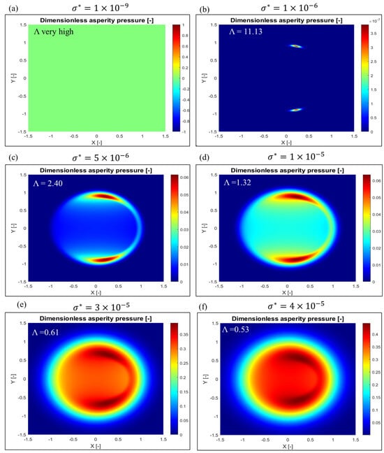 Isometric plots of dimensionless asperity pressure (present method) for different dimensionless roughness levels (σ* = σ/Rx).