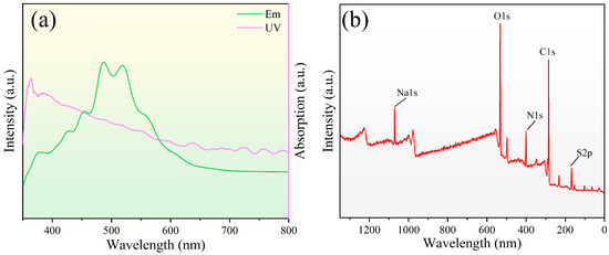 (a) Photoluminescence spectra and the UV–visible spectroscopy of the carbon quantum dot solution; (b) The X-ray photoelectron spectroscopy (XPS) spectrum of the carbon quantum dots.