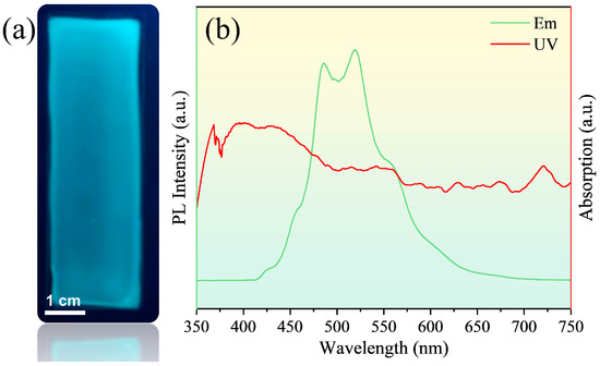 (a) Fluorescence of carbon quantum dot/PVA film under UV excitation; (b) The photoluminescence spectra and UV–vis spectra of the carbon quantum dot/PVA film.