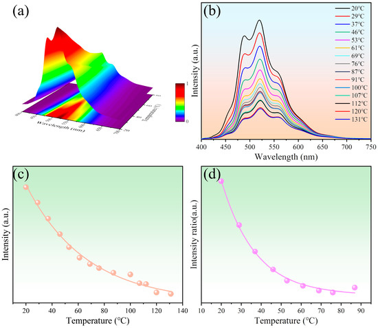 The photoluminescence spectra of carbon quantum dot/PVA films under varying temperatures are illustrated in Figure 4a,b. It is evident from the figure that the intensity of the quantum dot film decreases as the temperature increases. Among them, the emission peaks at 489 nm and 520 nm appeared to show a decreasing magnitude of different degrees, which seems to imply that the comparison of the two emission peaks has some correlation with the temperature. Firstly, the fluorescence intensity of quantum dots as a function of temperature was obtained by the temperature test system, as shown in Figure 4c. The fluorescence intensity of the 520 nm peak decreased gradually with increasing temperature due to the thermal activation of nonradiative-decay pathways. The intensity of the peak varied exponentially with increasing temperature in the temperature range of 20–130 °C. The gradient of the peak intensity variation per degree Celsius of the quantum dots decreased with increasing temperature, with the specific fitting function shown in Table 1. And after 130 °C, the fit of the fluorescence intensity as a function of temperature decreased, indicating that the quantum dots are not suitable for temperature detection at this time. It is worth stating that there is a remarkably favorable fit between intensity and temperature over a wide temperature range (goodness of fit R2 >0.99, with closer to 1 indicating a better fit), which provided constant thermal sensitivity over the entire dynamic range. It has been investigated that the prepared C quantum dots may contain multiple emission units. Recent reports suggest that the presence of multiple emission peaks may be caused by different surface functional groups [50,51,52,53,54], which makes it possible for the prepared carbon quantum dot film probes to be ratiometric fluorescent temperature sensors. The temperature dependence of the intensity ratio of the two emission peaks at 489 nm and 520 nm under 405 nm excitation is shown in Figure 4d. The fluorescence intensity ratios of the film probes exhibited an exponential fit to temperature over the temperature range of 20–80 °C. In addition, the goodness of fit R2 of the fluorescence intensity ratio is 0.996, indicating the excellent temperature-dependent performance of the quantum dots.