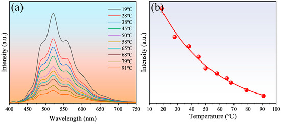(a) Fluorescence spectra of carbon quantum dots in liquid paraffin at different temperatures; (b) Temperature-dependent curve based on fluorescence intensity.