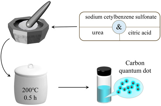 As illustrated in Scheme 1, Citric acid (0.3 g), urea (0.6 g), and sodium cetylbenzene sulfonate (0.3 g) were added to the mortar and ground thoroughly to make a homogeneous mixture of these three precursor powders repetitively, followed by the transfer of the blended powders to the crucible. The crucible was placed in an oven and heated at 200 °C for 0.5 h to obtain the generated product. The fluorescent carbon quantum dot solution was obtained by dissolving the resulting product into 200 mL of deionized water and filtering out the large-sized particles and magazines with a slow filter paper.