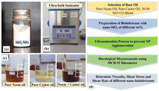 Nanoparticle selection and nanobiolubricant preparation: (a) SiO2 nanoparticles, (b) ultrabath sonicator, (c) biolubricants, (d) process flowchart for experimental study.