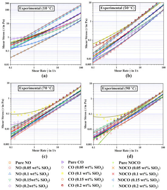 Variation in shear stress and shear rate relationship for different operating temperatures: (a) temperature 10 °C, (b) temperature 50 °C, (c) temperature 70 °C, (d) temperature 90 °C.