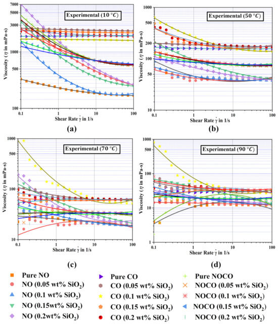 Variation in viscosity of NLs at different temperatures: (a) temperature 10 °C, (b) Temperature 50 °C, (c) Temperature 70 °C, (d) temperature 90 °C.