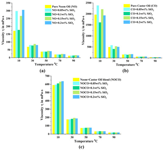 Figure 7a–c represents the detailed variation in viscosity measured for neem oil, castor oil and blend mixture. Maximum viscosity was found to be generated at near zero temperatures. At lower temperatures, the increase in viscosity was mainly influenced by the resistance offered by the NPs for the fluid motion. Such an increase in viscosity values was further affected by the increase in NP wt%. The highest variation in viscosity was observed at 0.2 wt% of nano-SiO2, showing a significant 260% increase in viscosity. The resistance offered by the addition of NPs was more than the molecular force resistance in the pure Neem oil. However, the addition of SiO2 NPs was found to have minimal impact on viscosity as the temperature increased to room temperature (30 °C) and above (70–90 °C). Such variation at room temperatures indicates that the volume of NPs blended in biolubricant needs to be increased to modify the rheological characteristics. The increase in the NP concentration in biolubricant further increases the contact area thus providing higher resistance. In Figure 7b, a non-uniform variation trend in viscosity was noted for varying concentrations of NPs in castor oil. In comparison with castor oil, around 113.6% increase in viscosity was noted for castor oil mixed with 0.05 wt% SiO2 nanoparticles compared to pure castor oil. The incorporation of 0.05 wt% SiO2 NPs led to an increase in the viscosity of neem oil at 10 °C. However, the effect of NPs on blend mixture of neem and castor oil was minimal.