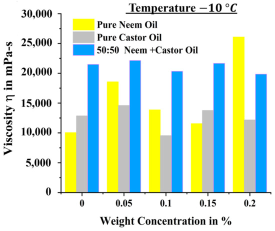 In this study, the addition of NPs has primarily affected the rheological behavior of lubricant at near zero and even subzero temperatures as indicated in Figure 8. At subzero temperatures (−10 °C), approximately 185% increase in viscosity was noted for Neem oil blended with 0.05 wt% SiO2 NPs than compared with pure Neem oil. With the addition of 0.1 wt% and 0.15 wt% SiO2 NPs, a further increase of 138% and 115% in viscosity was noted at −10 °C. With the addition of 0.1 wt% and 0.2 wt% SiO2 NPs, the viscosity of the castor oil decreases to 74.28% and 94.74% respectively, at −10 °C. At subzero temperatures, higher viscosities were noted for blend mixture of base oils than compared with pure neem oil and castor oil. From Figure 9, for different weight concentrations of NPs, higher viscosity was generated for castor oil. Further studies need to be conducted on castor oil to accurately assess the variation in rheological dynamics of castor oils as compared to neem oil or a 50% blend mixture. Due to the presence of castor oil in equal proportion in the blend mixture, higher viscosities were noted for varying temperatures when compared with neem oil as the base lubricant.
