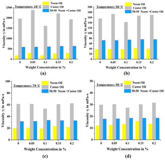 By analyzing the viscosity variations recorded in Figure 6, SiO2 NP addition was found to effectively influence the rheological flow behavior of neem oil, castor oil and 50% blend oils. The variations recorded for a temperature of −10 °C was not reported due to the exponential increase in viscosity at subzero temperatures. The variation in viscosity for different nano-biolubricants in the temperature range 10 °C to 90 °C is illustrated in Figure 7 and viscosity variation at −10 °C is represented in detail in Figure 8. For a clear understanding of the flow viscosity, Figure 6a–d represents the flow curves generated from 10 °C to 90 °C. At a near zero temperature of 10 °C, the viscosity of pure neem oil was 171.68 mPa-s, which was 11.45 times and 3.43 times lower than that of base castor oil and the 50% blend mixture. Further at 90 °C, neem oil viscosity was 12.058 mPa-s, which was only 2.47 times lower than pure castor oil. At higher temperatures, the variation in viscosity was found to be minimal for different base oils without NP additives. With the addition of nanoSiO2, an increase in flow viscosity was noted for neem oil. At 0.2 wt% of SiO2 NPs, around 10.37% increase in viscosity was noted in nano-neem oil at 70 °C. A gradual increase in viscosity was observed for different NP concentrations in Neem oil. With the increase in temperature, a reduction in viscosity can be noted for all tested cases of NLs. This phenomenon occurs because, at lower temperatures, the rise in viscosity is primarily attributed to the resistance posed by the nanoparticles against the motion of fluid particles. The lower viscosity is advantageous for reducing friction and decreasing power consumption. This phenomenon primarily occurs because, at higher temperatures, the nanoparticles absorb heat and extend the decay of cohesive forces. Elevated temperatures typically contribute to enhanced fluidity by providing additional energy to the fluid molecules. This increased kinetic energy helps overcome intermolecular forces, resulting in a reduction in viscosity [42].