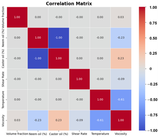 Figure 10 and Figure 11 represent the pair plot and correlation matrix generated for the interaction of multiple input parameters with lubricant viscosity. The effect of varying volume fractions of NPs, temperature, and shear rate during testing on the lubricant viscosity is clearly illustrated for a detailed analysis. Temperature variations were found to exert maximum influence on the fluid viscosity. However, with the addition of nanoSiO2 a nominal improvement in viscosity was noted for different base oils. Higher volume fractions of NPs were found to generate an increase in viscosity when compared with base oil with no additives. At 10 °C, the viscosities of different lubricant compositions reach a point of intersection. This convergence takes place in three different cases of base oils and the blend mixture with 0.05 wt% of nano-SiO2. The viscosity trend exhibits a noticeable change at this specific temperature, suggesting potential interactions or synergistic effects between these parameters. Further study into this viscosity crossover phenomenon could provide valuable insights into the underlying molecular dynamics and formulation behavior of these bio-oil–SiO2 mixtures.