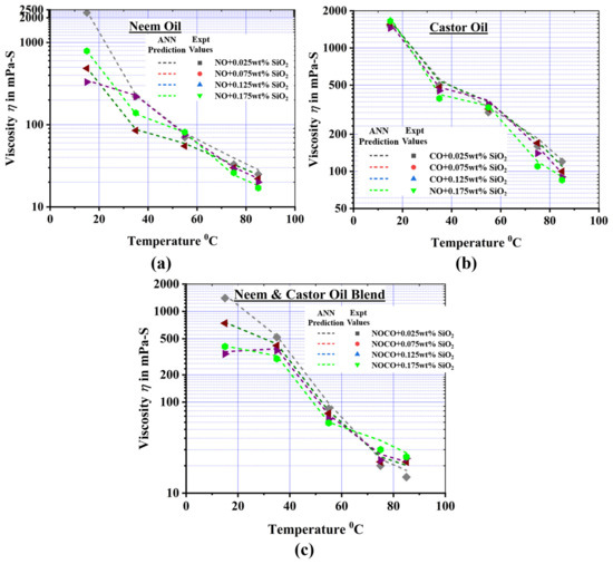Using the trained and validated ANN model, viscosity variations obtained for in-between weight concentrations of NPs (0.025 wt%, 0.075 wt%, 0.125 wt% and 0.175 wt%) were predicted and illustrated in Figure 13. The temperatures considered for prediction were 15 °C to 85 °C with an increment of 10 °C. For an increase in operating temperature, a significant variation in lubricant viscosity was noted for a broader range of NP weight concentrations. An optimum nanobiolubricant is such that it experiences minimal variation in viscosity for varied temperature conditions. With the increase in weight concentrations from 0.0125 wt% to 0.0175 wt%, a notable increase in biolubricant viscosity was observed for neem oil, castor oil, and the 50% blend mixture. However, as temperatures increased, the impact of the NP concentration became more pronounced in influencing viscosity variations. The predicted values were further validated through experimental investigations on the NP weight concentrations considered. A near accurate prediction was observed from the results depicted in Figure 13 for different biolubricants enriched with nanoSiO2 of varied concentrations.