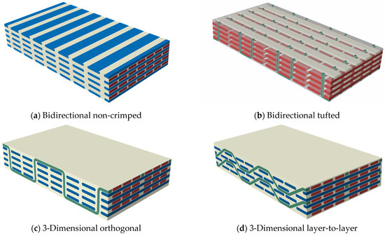 Schematic images of the CFRP composites tested and the structures of the architectural topology: (a) bidirectional non-crimped, (b) bidirectional tufted, (c) 3-dimensional orthogonal, and (d) 3-dimensional layer-to-layer architectures.