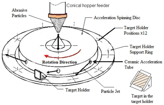 A centrifugal erosion tester was used in this study, which was developed at the Wolfson Centre, University of Greenwich, UK [27]. As shown in Figure 2, it consists of a feeder, a spinning disc with ceramic acceleration tubes inside, target holders which hold the test targets at desired angles and a control unit to drive the spinning disc at designed rotational speed so the particles can be accelerated to a designed impact velocity. Erodent particles are continuously fed into the spinning disc at the central feeding point of the disc and accelerated through the radical acceleration tubes by centrifugal force. The particle velocity is controlled by the rotational velocity of the disc. When the particles are ejected from the end of the tubes, the particles travel at the pre-set velocity and strike the target at a designed impact angle which is set by rotating the target holder. The detailed calibration of the impact velocity and impact angle can be found in the previous study [28].