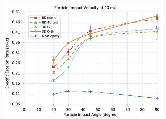 Erosion experiments were undertaken to evaluate the erosion of the CFRP textile composites. The specific erosion rates are shown in Figure 3 as a function of impact angles. The result of neat epoxy is also included for the same erosion conditions but with a smaller erodent particle size (D50 at 238 μm), which is taken from a previous study [25].
