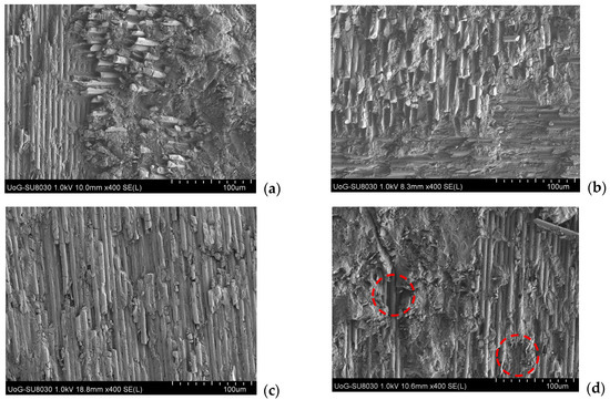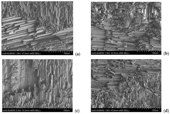 Because neat epoxy has a much better erosion resistance compared to carbon fibres, it was observed that the fibres experienced more material losses once they were broken. For the composites with denser carbon fibre architecture, epoxy contributed more wear resistance, as seen in Figure 5b,d. Therefore, the architectural topology of the textile composites predisposes the structure to more matrix-rich and matrix-pockets to have a better erosion resistance, as the fibres break down quickly. So, the broken fragment of the individual fibre bundles is the erosive mechanism for the textile composites studied. SEM photos of the eroded surfaces of the composites tested at the 20° impact angle are shown in Figure 6, which may give a different angle of the erosion mechanism. The SEM photos show little difference in the eroded surfaces in comparison with those profiles at the high impact angle. The composite materials all have a similar response across the two angles. Therefore, scratching and cutting can be the main wear mechanisms for erosive wear of these types of composite materials, as reported in the literature [14,23].