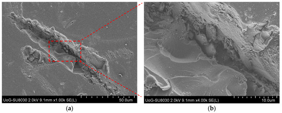 As a comparison, SEM photos on the eroded surface of the neat epoxy polymer were taken and shown in Figure 7. The erosion results in Figure 3 indicate that the neat epoxy polymer has an erosion mechanism that is different from the CFRP composites, as the neat epoxy behaves like a ductile material. The photos in Figure 7a clearly show that the neat epoxy polymer is eroded by cutting and scratching. In the figure, it shows a long cutting crater along the material surface and almost no debris appeared in the image. With the zoomed-in photo (Figure 7b), the cutting mechanism is shown clearer. Compared to the images of CFRP composites, which show a lot of fibre debris, the eroded neat epoxy surface is clean. Thus, the SEM photos indicate the differences in erosion mechanisms between the two types of materials.