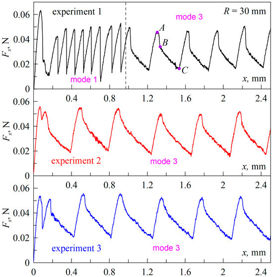 Figure 2 shows the experimentally measured dependencies of the friction force Fx on the value of tangential displacement x of the indenter, where the results of three consecutive experiments are depicted in different panels. In each experiment, the indenter was first immersed to a depth of dmax = 0.2 mm then pulled to a zero level of d = 0.0 mm, followed by tangential displacement. Moreover, the initial indentation to a depth of dmax in all experiments was carried out at the same location of the elastomer to ensure the same experimental conditions. Figure 2 shows the dependence plots corresponding to tangential shear without indentation and detachment phases in the normal direction, where the indenter was not horizontally displaced (i.e., x = 0 mm). In the first experiment (upper panel), after the motion starts, the tangential force first increases to some maximum and then decreases. This maximum is associated with additional strengthening of the contact during normal indentation when tangential shift did not occur; a similar situation was observed in [22] for another geometry of the experiment and much bigger sliding velocities. At further shear, as it follows from the figure, a stationary mode of stick–slip friction mode is established, which we denote as “mode 1”. In this stick–slip mode, once the friction force reaches its maximum value, it decreases sharply, which can only be due to gross slip, i.e., “mode 1” is a stick–slip mode in the classical sense. Such a mode can be theoretically described within the framework of models existing in the literature, such as, for example, [25]. However, in the present work, we limited ourselves to a detailed description of the experiment.