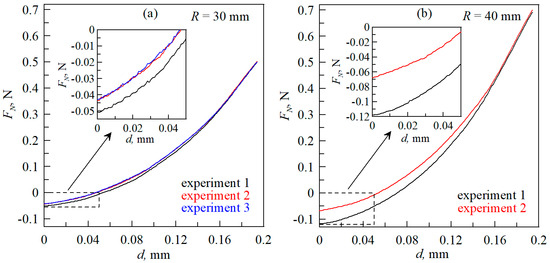 Dependencies of the normal force FN on the indentation depth d corresponding to the pulling phase of the steel indenters from the CRG N3005 elastomer: (a) the results of three experiments with an indenter with a radius R = 30 mm are shown; (b) the results of two experiments with an indenter with a radius R = 40 mm are shown.