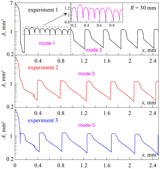 Dependencies of the contact area A on the indenter coordinate x corresponding to three consecutive experiments, the data of which are shown in Figure 2, for an indenter with a radius R = 30 mm. Supplementary videos (Videos S1–S3) are available for the figure.